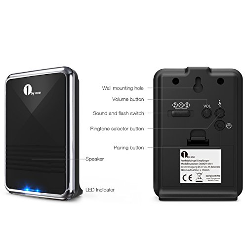 1byone Easy Chime Wireless Doorbell Kit, 1 Receiver & 1 Push Button with Sound and LED Flash, 36 Melodies to Choose, Battery Operated