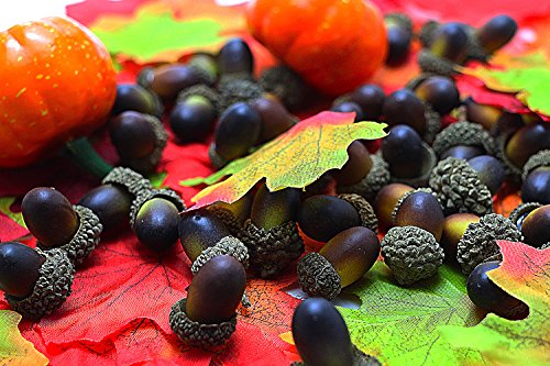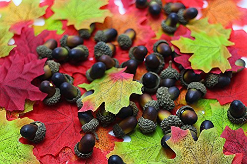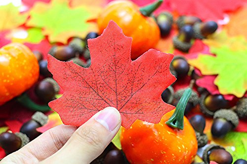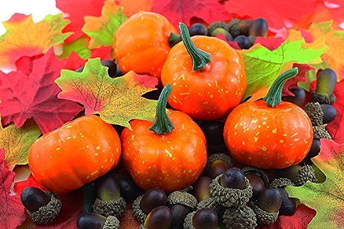 Etmact 155pcs artificial autumn decorating kit contains 100pcs Maple leaves, 50pcs Acorns and 5pcs Pumpkins.