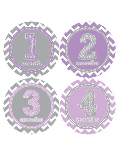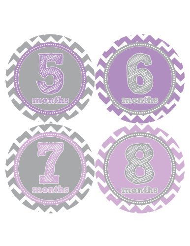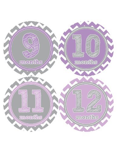 -. Binding : Baby Product -. Brand : Months In Motion -. Color : Lavender, purple, grey -. Department : Baby-girls -. EAN : 0764130835238 -. Feature : Just peel, stick, and take a photo to document your baby's first year! / Makes a wonderful shower gift! / The perfect baby photo prop! / P.R.Inted on white matte sticker so no glare in photos / Includes 12 precut stickers that are approximately 3.93 inch diameter -. Label : Months In Motion -. LegalDisclaimer : Stickers are to be used under adult supervision only. Do not leave stickers on baby unattended. -. Manufacturer : Months In Motion -. Model : 024 -. PackageQuantity : 12 -. ProductGroup : Baby Product -. ProductTypeName : BABY_PRODUCT -. Publisher : Months In Motion -. Studio : Months In Motion -. Title : Months in Motion 024 Baby Month Stickers Baby Girl Purple Chevron Monthly Age -. UPC : 764130835238