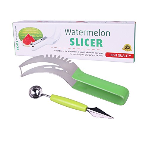 - The combo of watermelon slicer and Melon Baller with Fruit Carving Knife brings together the essential tools to slice, cut , dice, ball, carve and scoop fruits in a single package.Top favorite kitchen tool/gadget for your home.