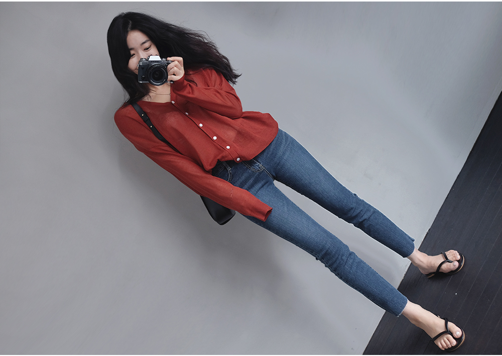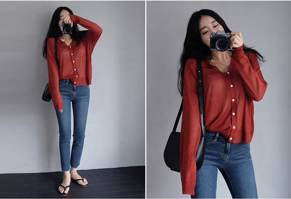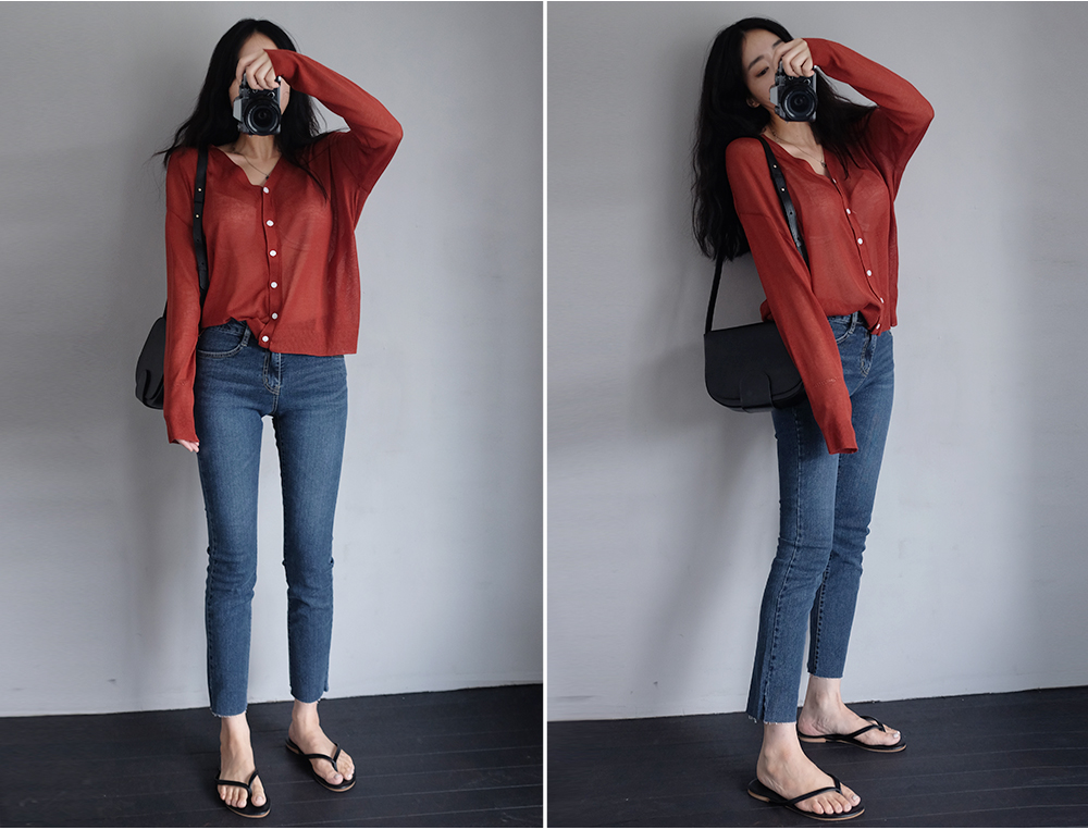 브이네크라인으로 갸름한 페이스라인처럼 보여주고
