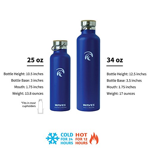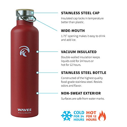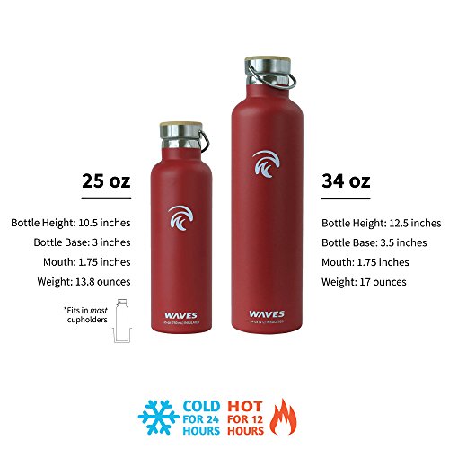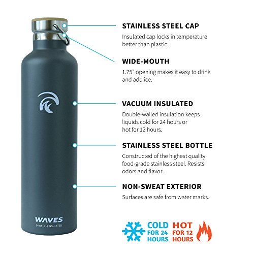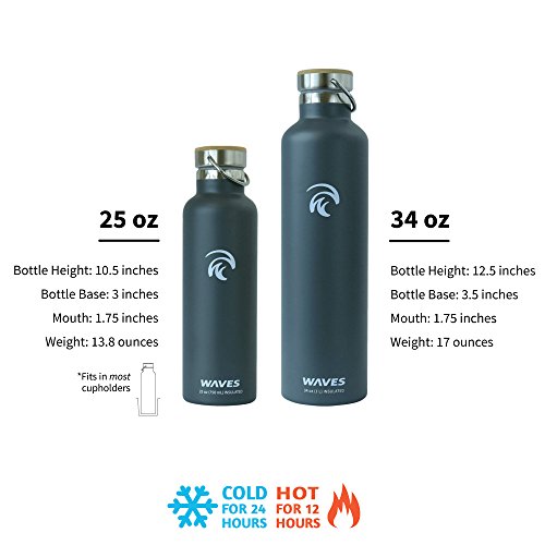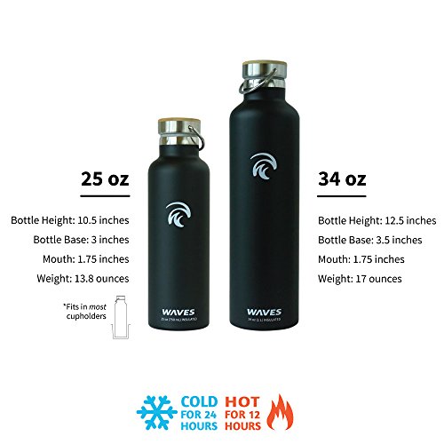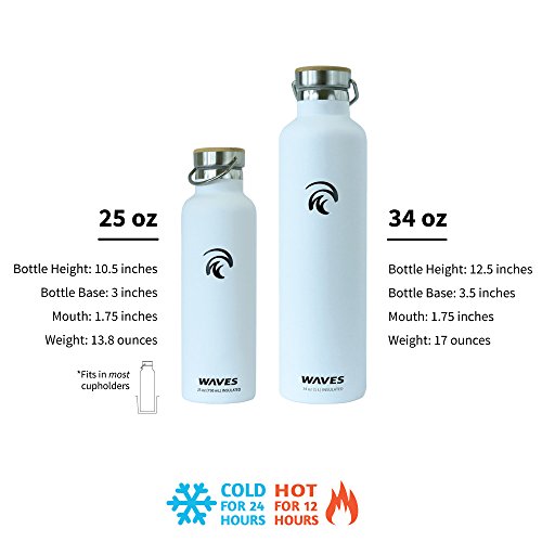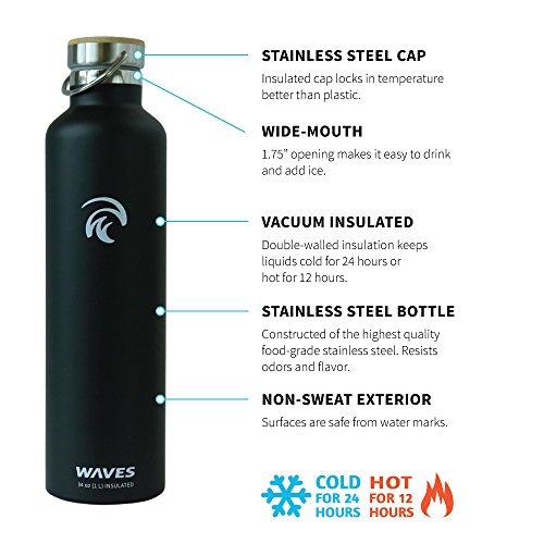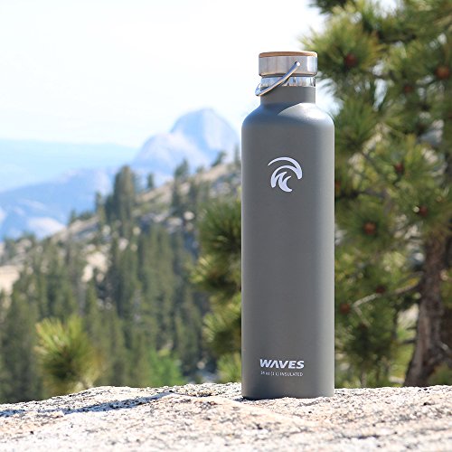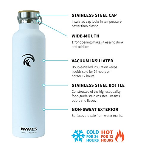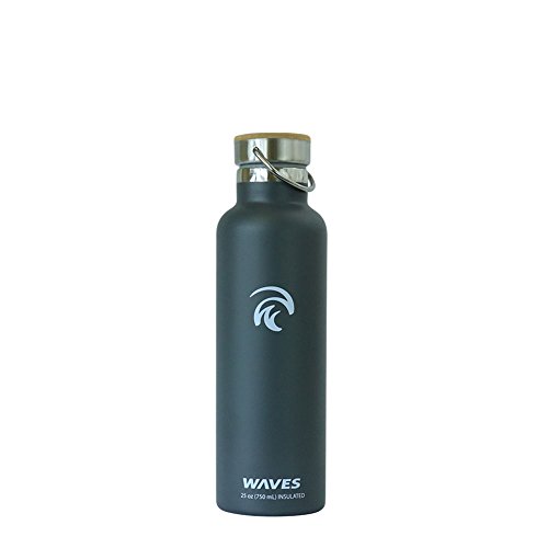 Studio : Waves Gear Publisher : Waves Gear Product Description Keep your hot drinks steaming and your cool beverages icy cold all day long with the Waves Forever Cold insulated thermos water bottle. This uniquely designed hot water and cold water thermos uses dual pain stainless steel construction to keep drinks cold for up to 24 hours and hot for up to 12 hours. Take this cleverly designed steel thermos to the office, on a long hike, on a road trip, or camping and you'll have piping hot and ice cold beverages all day long. Waves is crafted to look sleek and modern with a stainless steel cap, bamboo top plate, and gentle, swell wave shape. This insulated cool water aluminum thermos is made of non-toxic materials, is BPA-free, and comes in black, silver, and white. 0