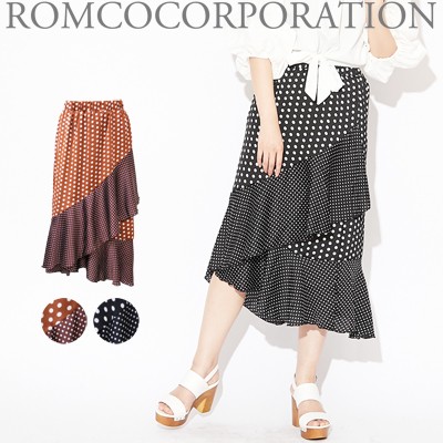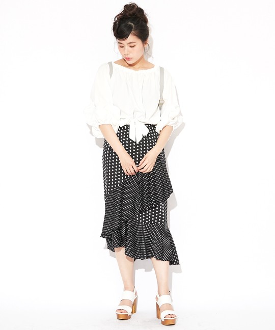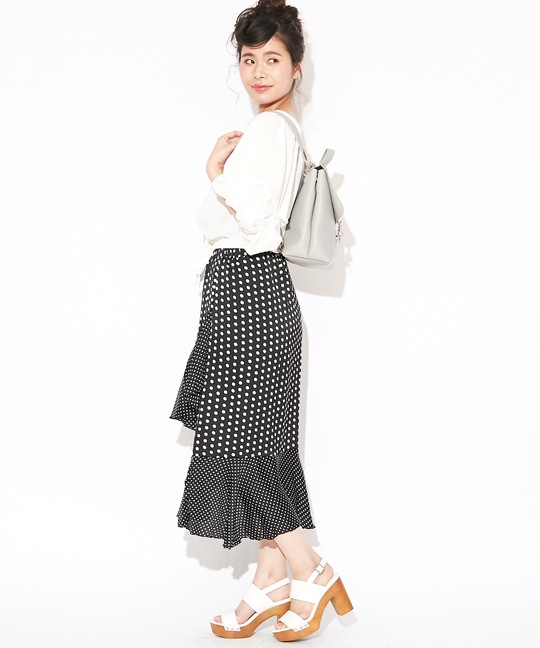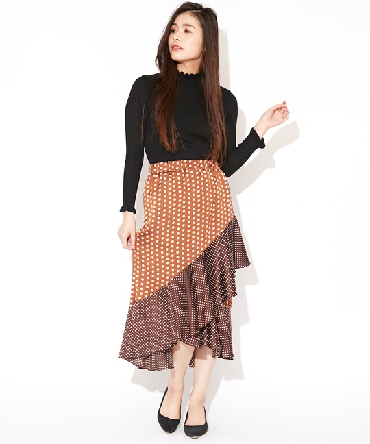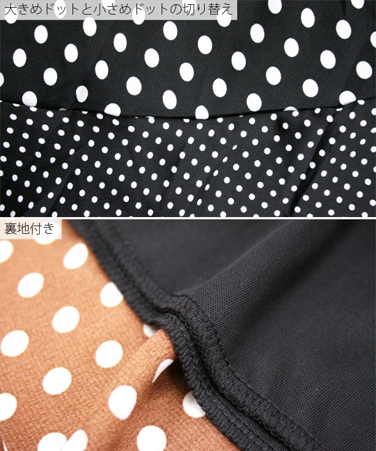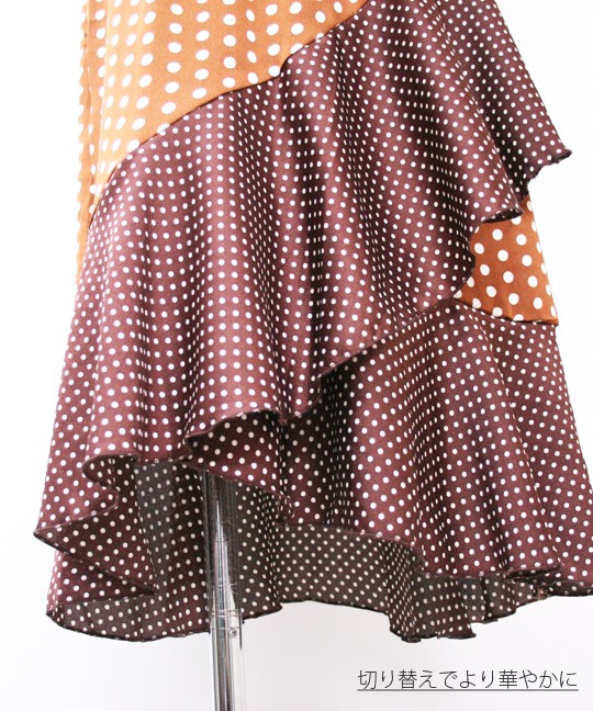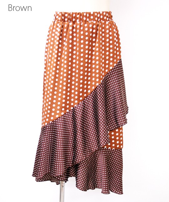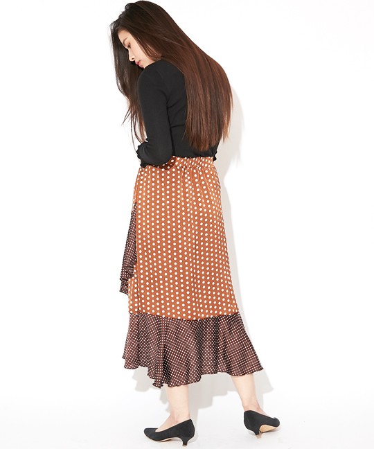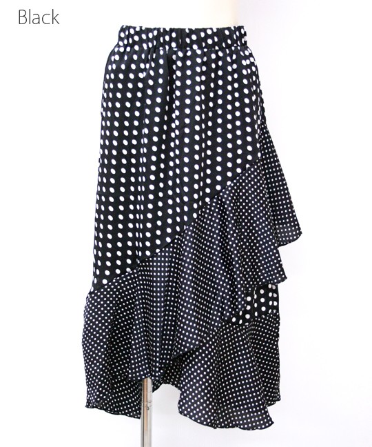 トレンドのドット柄を使用した個性派スカートです。ドットは大きいものと小さいものがミックスされていて、インパクトがあるアイテムに仕上がっています☆フリルの切り替えが上品かつ豪華なので、トップスはシンプルなものでOK!また、前の2段のフリルに比べて後は裾のフリルしかなく、うるさくなりすぎないのがこのスカートの特徴です。足首を華奢に見せてくれる効果も♪裏地つきなので安心して着用していただけます。※やや光沢のある生地です。 モデル 身長165cmMサイズ