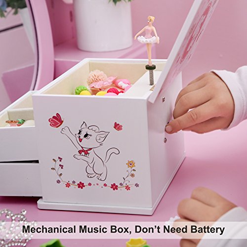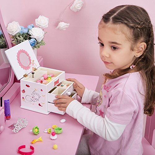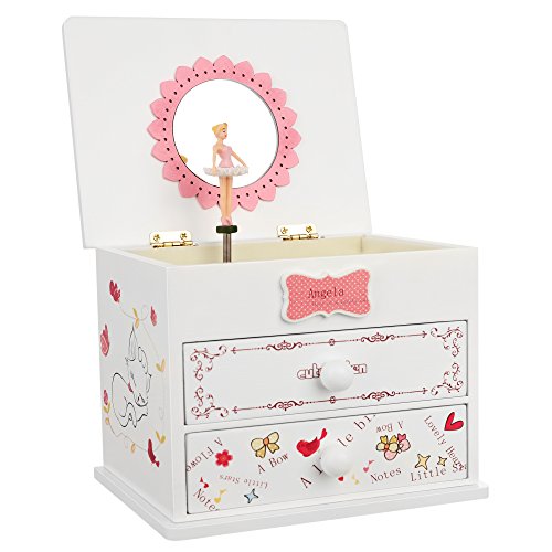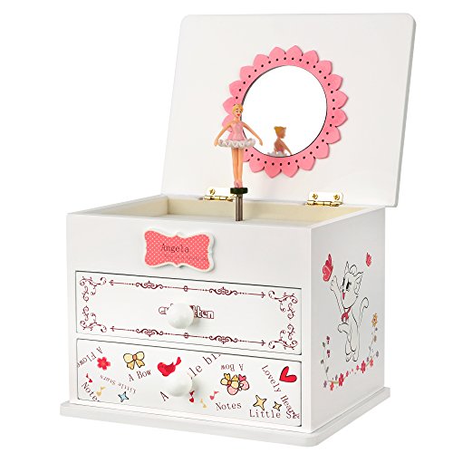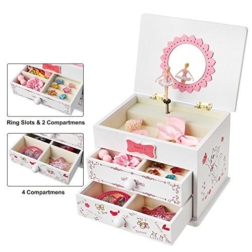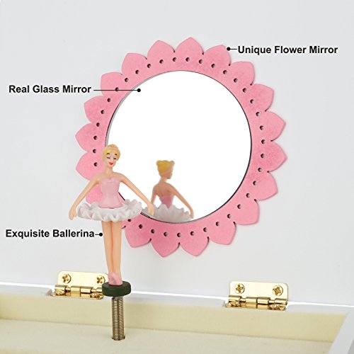 Studio : Songmics Publisher : Songmics Binding : Kitchen Product Description Do you need a sweet musical jewelry box to bring joy to your little girl's world? Then, you are in the right place! This SONGMICS adorable jewelry music box has a sweet and fun appeal that will capture her imagination. The hinged lift lid opens to a delicate flower mirror that your little one can fill to her heart's content. She'll be captivated as she watches the twirling ballerina and listens to the cheerful melody of "FUR ELISE". Just an easy turn of the winding key on the back of the jewelry box will keep the figurine and music going for as long as your girl wishes, perfect for a dancer. The assorted compartments and drawers allow for ample storage and lets her arrange her items as she pleases. Everyone deserves a ballerina musical jewelry storage box. Specifications: - Main Color: White - Material: Medium Density Fiberboard (MDF), Flocked Fabric, Hardware - Product Size: 5 7/8"L x 4 1/2"W x 4 7/8"H(15 x 11.5 x 12.3cm) - Product Weight: 1.9lbs Package Contents: - 1 x Musical Jewelry Box - 1 x Cleaning Cloth Notes: - Avoid direct exposure to the sun. - Avoid sharp, pointed objects like knives to prevent scratches. 0
