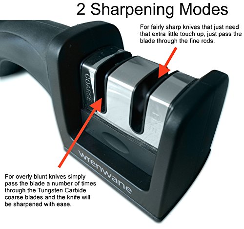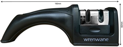 The Knife Sharpener For Your Needs The Wrenwane Kitchen Knife Sharpener is a practical and simple solution to blunt knife woes. It is a light-weight and attractive looking knife sharpener and will not look out of place sitting on the kitchen table. There are 2 sharpening modes for blunt knives and those that just need touching up. The blades are made of tungsten carbide (for coarse) and the rods are made of ceramic (for fine) and are angled in such a way that both sides of the knife will be sharpened at the same time. The sharpener is designed specifically with safety in mind. The rubber non-slip feet eliminates any sliding when in use and the handle is large which allows for a firm grip when sharpening.