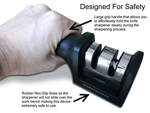 DESIGNED FOR SAFETY - For safety this your number 1 choice. What matters most, it has been designed specifically to protect YOU! Unlike many other devices on the market, the Wrenwane sharpener has a large grip handle that allows you to effortlessly hold the knife sharpener steady during the sharpening process. Additionally, the feet are non-slip so the sharpener will not slide over the work bench either making this device extremely safe to use. Every chef will be happy with this sharpener.