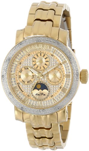 -. Feature : 12 genuine diamond hour markers on the bezel / Sparkling, pave, dial / Sub dials include day, date, month, and am/pm indicator / Stainless steel, gold-tone, bracelet with an engraved Akribos XXIV logo on the clasp / Water resistant to 165 feet (50 M): suitable for swimming and showering
