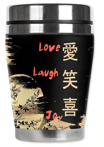 Mugzie Love, Laugh, Joy "Mini" Travel Mug with Insulated Wetsuit Cover, 12 oz, Black