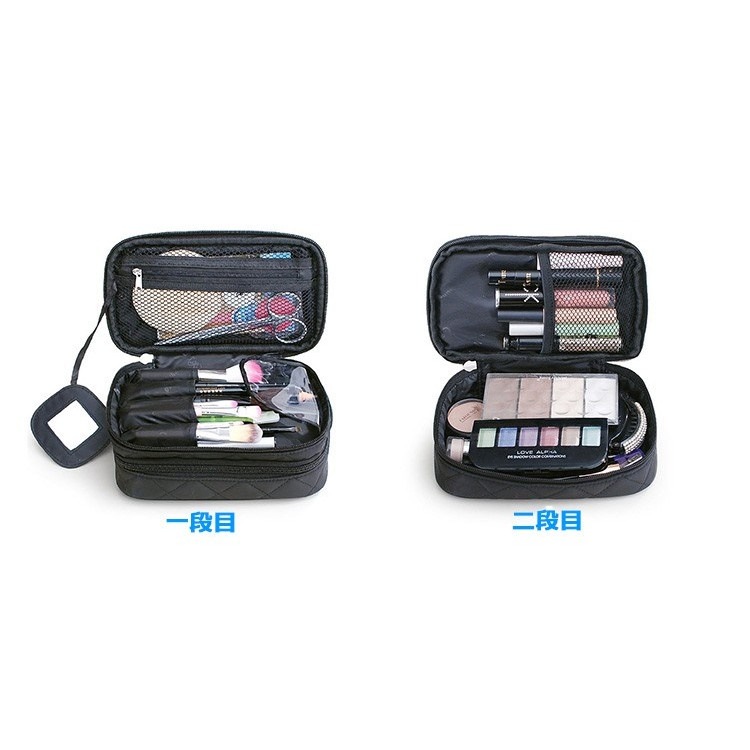 2段タイプなので大容量で、たっぷりメイク道具が入り、ミラーも付いてるので、ちょっとしたメイク直しにも重宝します。