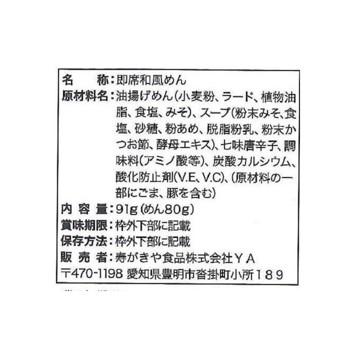 원재료:유부 면(소맥분,라드,식물성 기름지,식염,된장)고, 분말 된장,식염,설탕,분 아 #고, 7가지 양념,탈지분유,분말 가다랭이절,효모 엑기스,조미료(아미노산등)고, 탄산 칼슘,산화 방지제(V.E,V.C)고,(원재료의 일부에 돼지를 포함한다)