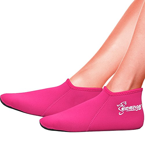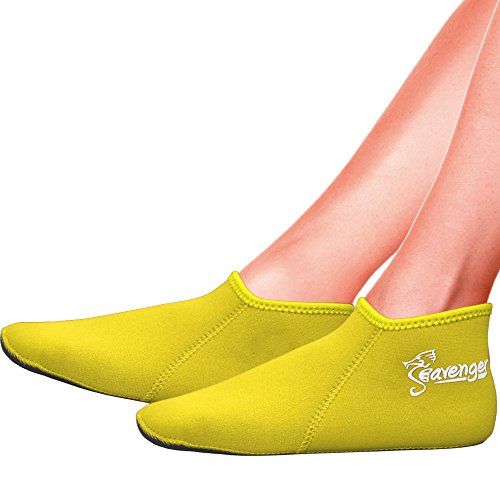 Seavenger ultra-comfy 3mm neoprene socks are the perfect companion for snorkelers/divers or to walk on the sandy beach. Made with high quality material with 4-way stretchable neoprene for those who like to wear foot pocket fins or as water-shoe liners. Designed for excellent protection from cold and/or blistered. Dotted silkscreen sole pattern, and all seams are glued blindstitched for durability and comfort. Ideal 3mm socks for diving, snorkeling, standup paddle boarding, kayaking, canoeing and other water sports where feet need to stay warm. Shaped for easy donning, doffing and smooth designed neck prevents chafing. Available in multiple sizes, see chart for selection. Various colors to select from Materials: 90% Neoprene, 10% Nylon Jersey