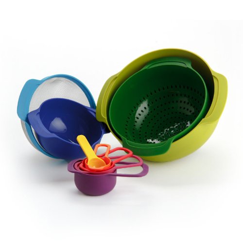 • Set includes 10.5-inch mixing bowl, 9-inch colander, 7.5-inch sieve, 6-inch bowl with measurements and spout, 1/4, 1/3, 1/2, and 1 cup measuring cups and 1 Tbls