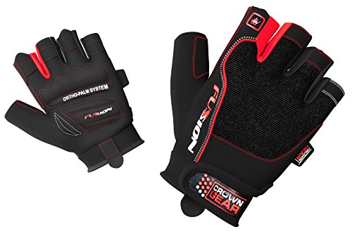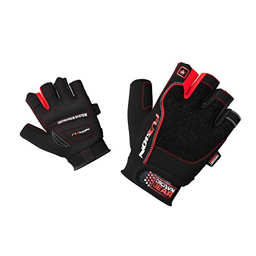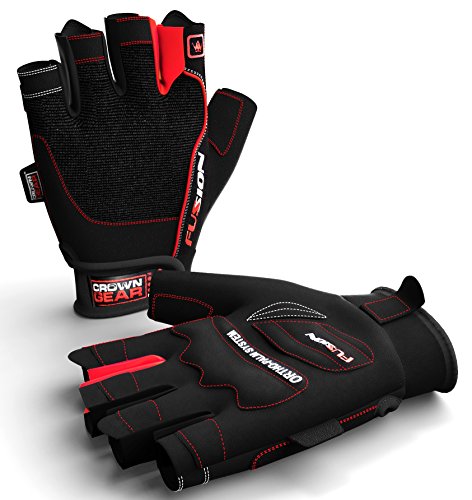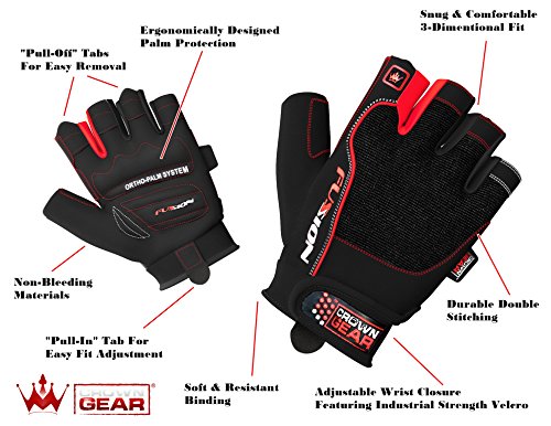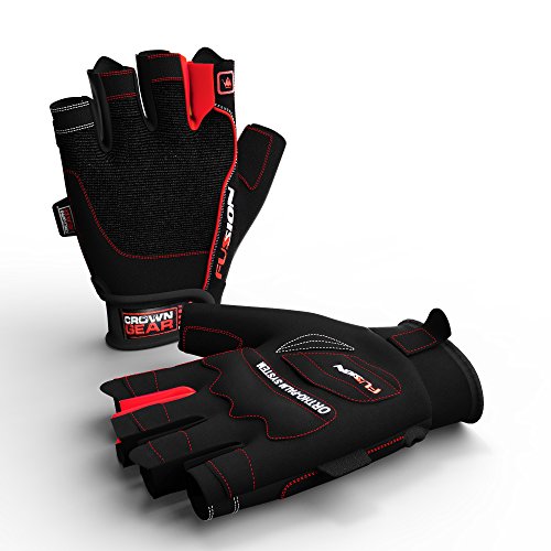 -. Feature : FUSION WEIGHTLIFTING GLOVES PROVIDE EXTRA GRIP, as well as palm and finger protection. This can improve your weightlifting performance over night, as it allows you to focus on larger muscles in the arms and legs. / USING FUSION WEIGHTLIFTING GLOVES DOESN'T REDUCE YOUR NATURAL GRIP STRENGTH. In fact, as you work out with gloves your grip strength will continue to develop at a normal pace. / FUSION WEIGHTLIFTING GLOVES CAN BE WORN FOR AN ENTIRE WORKOUT, or used for key sets. If you're an athlete with a clear plan in mind, then Fusion gloves are ideal as they allow you to take control of your progress. / Crown Gear Fusion gloves prevent sweat from reaching the lift surface, reducing the risk of a slip or twist injury. The padded palms also protect against calluses and cuts, both of which can lead to hand injuries or infections. Working out safely should be a P.R.Imary goal of every athlete, professional or amateur. / CROWN GEAR FUSION WEIGHT LIFTING GLOVES ARE ERGONOMICALLY DESIGNED to conform to the natural shape of a hand. The padded palm provides protection and improves grip, while the pull-on and pull-off tab system makes it quick and easy to get them on and off. Double stitching, high quality materials and new generation industrial strength Velcro make these gloves comfortable and durable