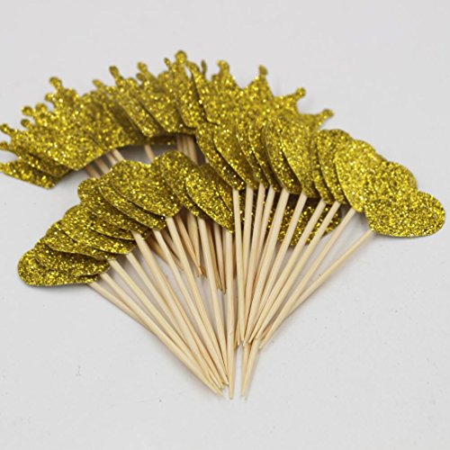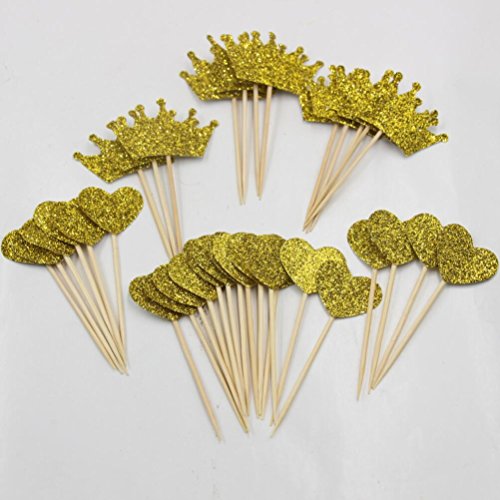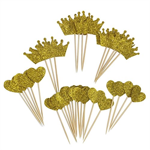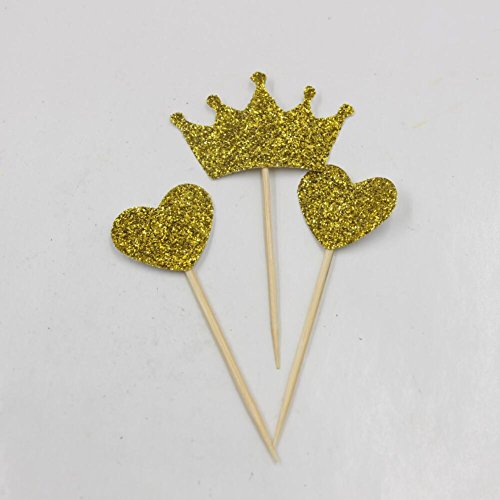 Mybbshower Gold Glitter Heart and Crown Cupcake Topper for Birthday Dessert Table Pack of 36