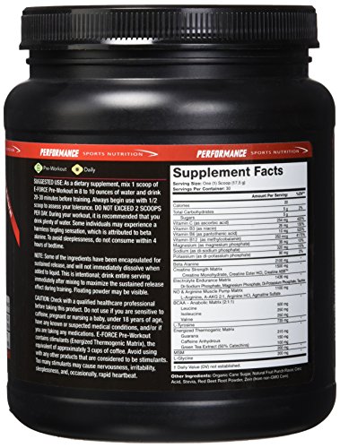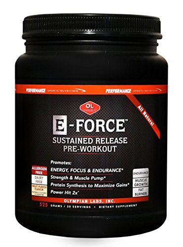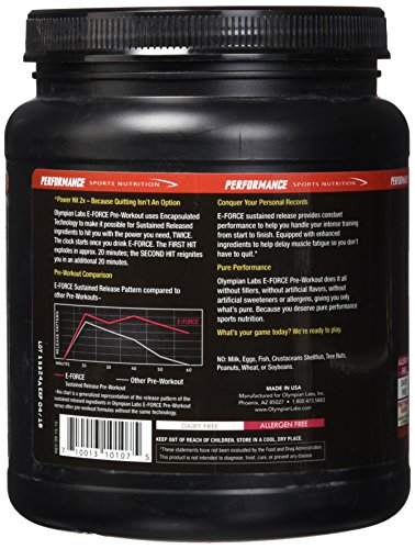 ReleaseDate : 2015-10-17 Studio : Olympian Labs, Inc. Publisher : Olympian Labs, Inc. Binding : Health and Beauty Product Description Olympian labs e-force pre-workout uses encapsulated technology to make it possible for sustained released ingredients to hit you with the power you need, twice. The clock starts once you drink e-force. The first hit explodes in approximately 20 minutes; the second hit reignites you in an additional 20 minutes. E-force sustained release provides constant performance to help you handle your intense training from start to finish. It's equipped with enhanced ingredients to help delay muscle fatigue so you don't have to quit. Olympian labs e-force pre-workout does it all without fillers, without artificial flavors, without artificial sweeteners or allergens, giving you only what's pure. Because you deserve pure performance sports nutrition. 0