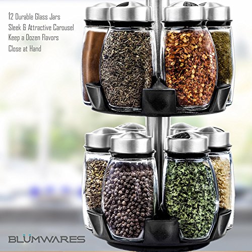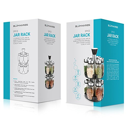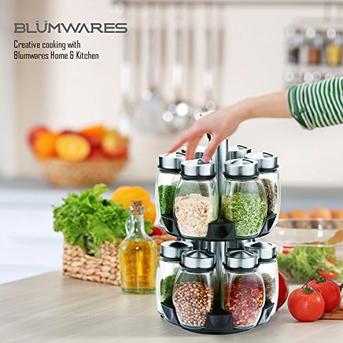 Studio : Blumwares Publisher : Blumwares Product Description Spice for your kitchen decor. This fully equipped spice rack from Blumwares equips you with the culinary tools you need to take a ho-hum dinner and transform it into a gastronomic extravaganza. All too often, easily usable spice racks present themselves as clunky and ugly, while handsome racks are fragile or frustratingly inaccessible. Leave it to Blumwares to strike the perfect balance: Our spice jar rack provides effortless functionality alongside gorgeous looks, all without cluttering your countertops. That's our version of flavoring something just right. Top-Tier QualityWhen it comes to kitchen countertop appliances, flimsy just doesn't get it done That's why you need Blumwares' trusted quality and premium craftsmanship. Rest assured that this rack is meant for serious chefs. It won't bend, break, or shatter. Sleek, Striking DesignSomething this useful is rarely this striking to look at. As you spin the carousel to easily find the perfect spice for your dish, enjoy its flashing metallic finish that's complemented by premium crystal-clear glass jars. It's a tasteful culinary piece. See Before You SpiceNeed marjoram? Whirrr. Got it. Oregano? Spin. There you go. With a dozen spices all within a moment's reach, making dinner is no longer a chore but a joy! The clear glass jars make it easy to identify contents before you pour on the flavor. No Assembly NecessaryHow great is that? No assembly is required. The Blumwares spice jar rack arrives to your kitchen fully assembled, so you can just pop it out of the box, fill the jars with twelve of your favorite spices, and get cooking with conviction and control. Built to Perfect SizeOur designers had you in mind when designing the Blumwares spice jar rack. We know counter space is at a premium, so we kept the dimensions sleek Rack Measures: 16 x 15.8 x 30.2 cm Each Jar Measures: 4 cm x 9 cm 0