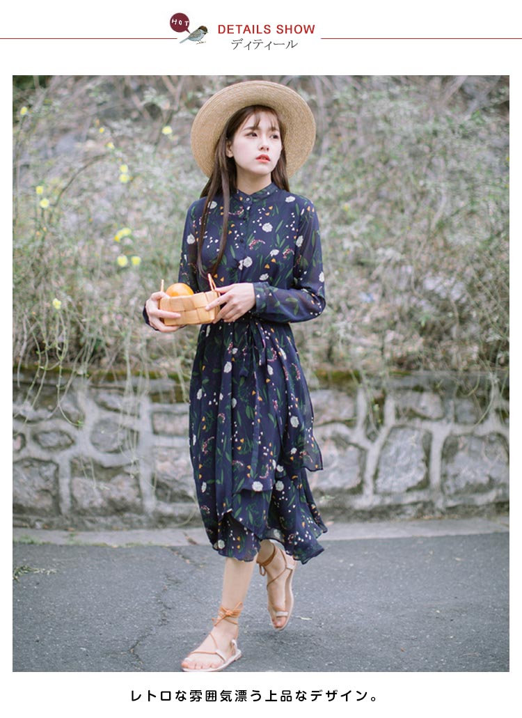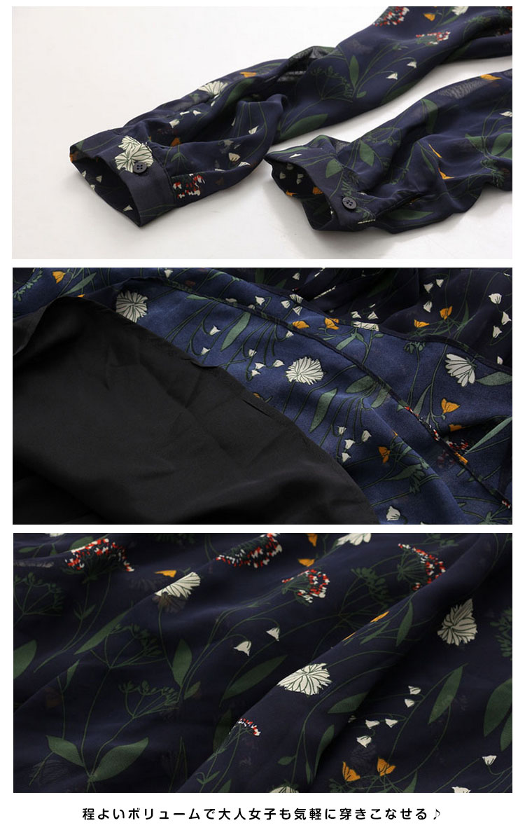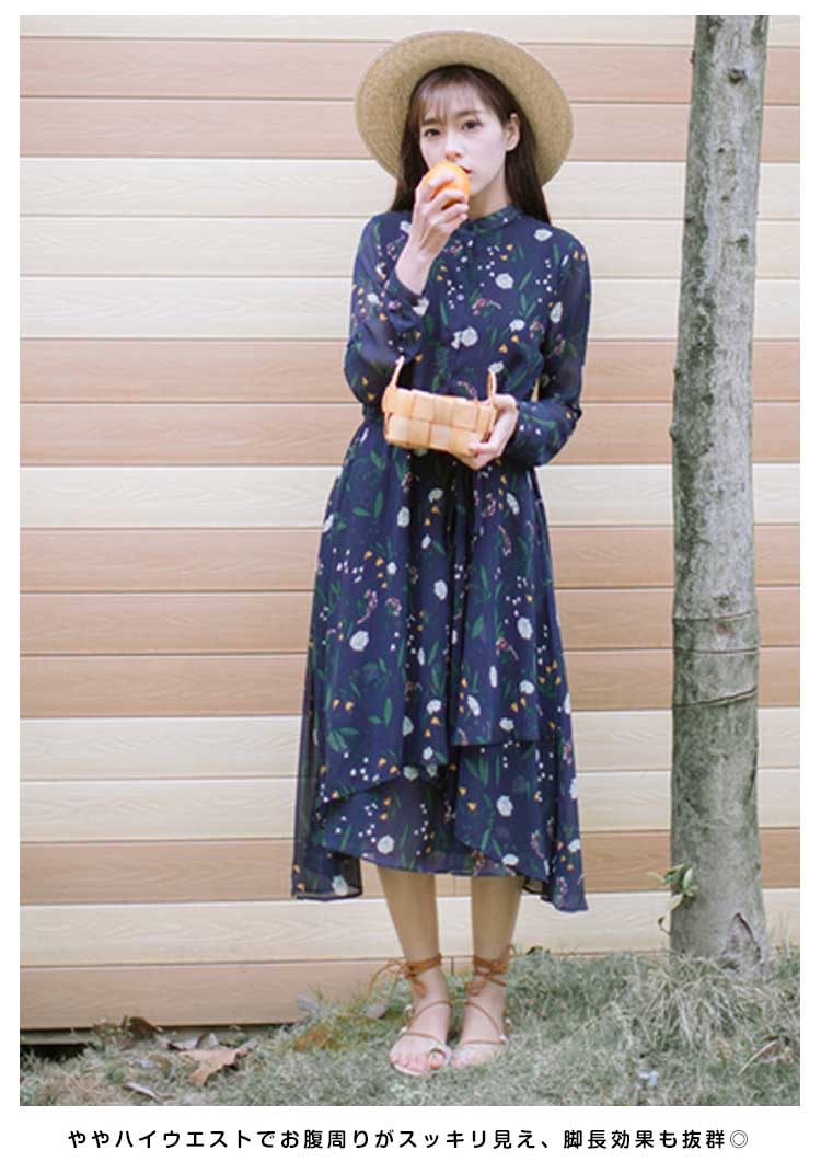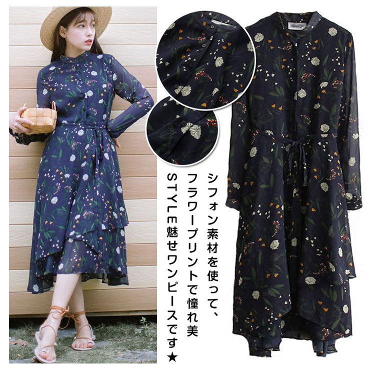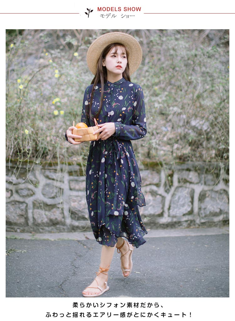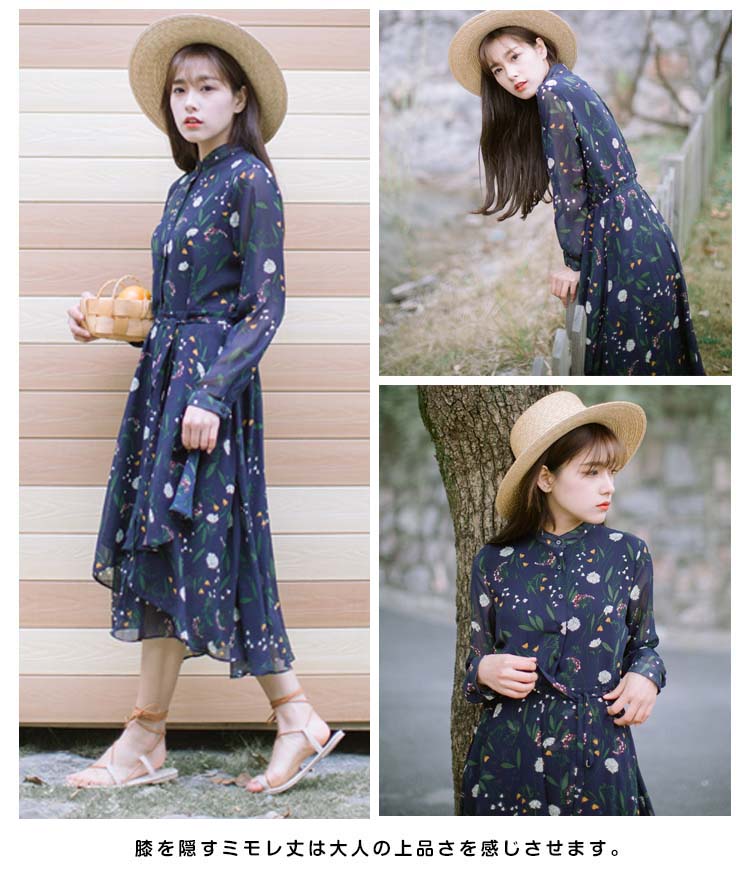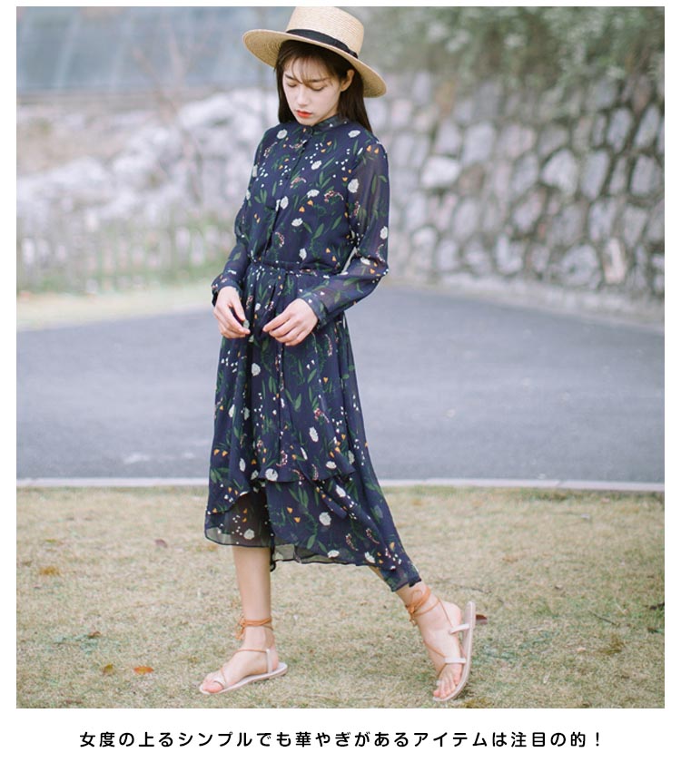 | シフォン素材を使って、フラワープリントで憧れ美Style魅せワンピースです★柔らかいシフォン素材だから、ふわっと揺れるエアリー感がとにかくキュート!ややハイウエストでお腹周りがスッキリ見え、脚長効果も抜群◎膝を隠すミモレ丈は大人の上品さを感じさせます。女度の上るシンプルでも華やぎがあるアイテムは注目の的! | |