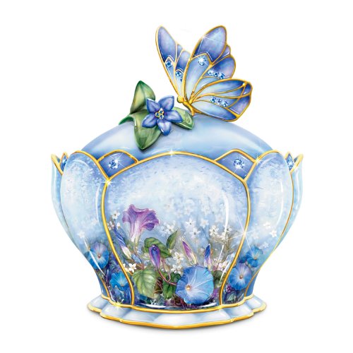 Feature : Follow whispering wings through gardens of tranquility with this striking butterfly music box by Lena Liu, available only from The Bradford Exchange / Handcrafted of Heirloom Porcelain® to the exacting standards of Limoges-Turgot, hand-underglazed in luminous pastels and triple-fired for lustrous beauty / The exclusive design recalls the delicate petals of a flower, crowned by a dainty sculpted butterfly / Hand-set sapphire-colored Swarovski® crystals and 22K gold accents add extra delight while a golden-scripted sentiment, "You Are a Precious Jewel to Treasure Forever", beneath the lid adds the perfect finishing touch / At the turn of a key, plays the melody of "On the Wings of Love"