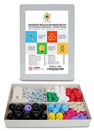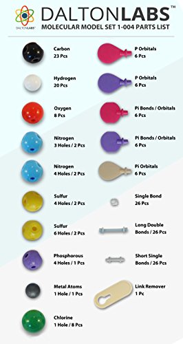 - Feature : CHEMISTRY MOLECULAR MODEL KIT: Educational models for organic and inorganic chemistry learning. Molecule Set designed for advanced science learning. Model organic structures, cyclic compounds, and stereoisomerism. Learn by doing with Dalton Labs. / BASIC TO ADVANCED LEARNING: 178 piece set provides hands on activity to students from grades 7 up to Graduate Level studies to visually demonstrate molecular geometry and structure of compounds & other molecular shapes. Chemistry molecular model set makes learning 3d makeup or atomic structures fun and interactive. / MOLECULE SCIENCE IN 3D: Includes pieces of atom centers, bonds, and orbitals for assembly and tool for removing bonds inorganic molecules, empirical formula representations, organic structures, and other concepts of inorganic and organic chemistry. / PRO SCIENCE EQUIPMENT FOR MODEL BUILDING: Made from high quality durable materials designed for easy construction and perfect fit. Pieces are color coded to national standards for easy ID. Includes box for storage and transport. Excellent for the classroom. / YOUR SATISFACTION IS GUARANTEED - Dalton Labs is a USA family owned business. We always offer a 100% No Questions Asked Money Back Guarantee. Dalton Labs uses only the highest quality materials in their products. Your satisfaction is our priority.