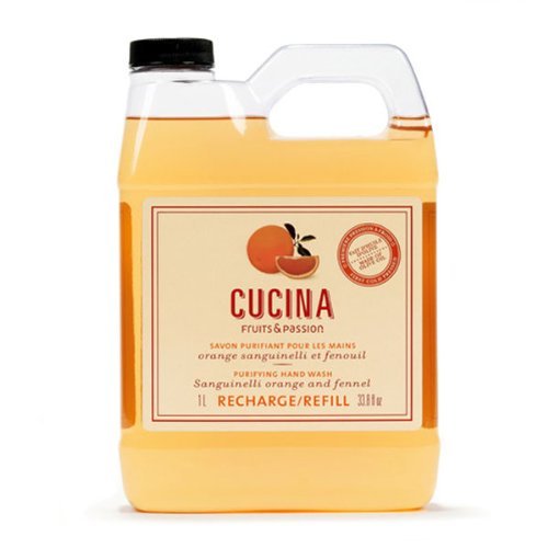 Fruits & Passion Cucina Hand Soap 33.8 ounce Refill - Sanguinelli Orange and Fennel is specially designed to be used in the kitchen and cleanses hands effectively and gently. It is made with olive oil and other softening and revitalizing plant extracts. It is delicately scented and rinses off completely to avoid interfering with the flavor of your favorite food. Can be used to refill bottle. A delectable fusion of Sanguinelli orange and fennel makes this fragrance subtle yet fresh. Its smooth bouquet of orange mingles with fresh, green fennel notes atop a musky base.Eco Specifications: