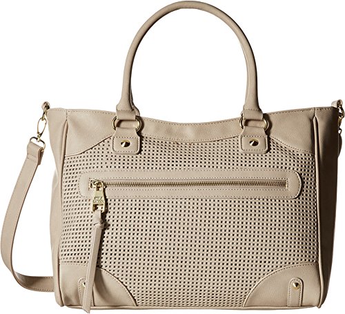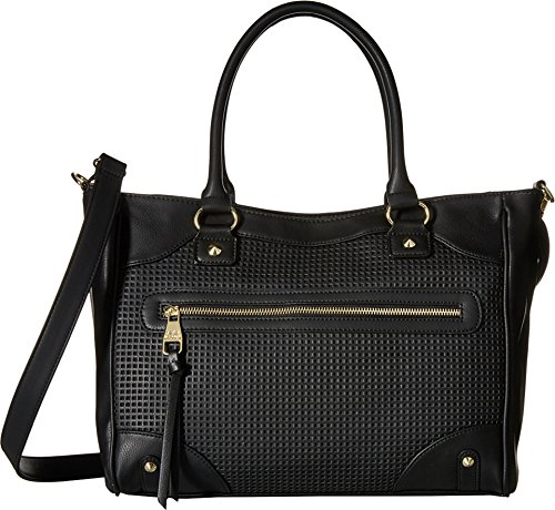 Top zip closure. Dual rolled carry handles. Removable and adjustable crossbody strap. Exterior features perforated detail and zip pocket at front, brand plaque at back, and polished hardware. Flat base. Lined interior flaunts back wall zip pocket and two slip pockets. Imported.