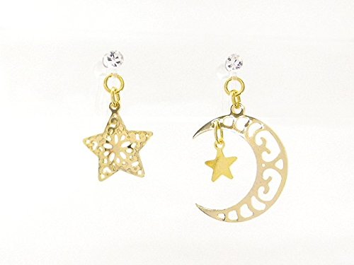 -. Title : 【樹脂製】透かし模様の星と月のアシンメトリーノンホールピアス【イヤリング】【イアリング】
