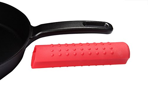 Measures 17.25"Length with 10.25"Width and 2"Depth. Combo pack of cast iron grill pan and red silicone hot handle holder.