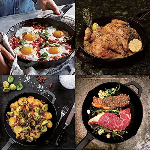 Heavyweight cast iron provides long lasting durability, transfers and retains heat evenly, great for frying, sauté, baking, grilling, braising and more