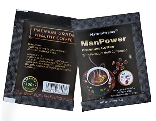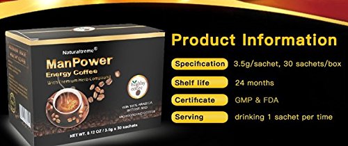-. Feature : HIGH QUALITY - 100% Arabica instant coffee infused with all natural pure extracts of Ganoderma (15% Triterpenes), Tongkat Ali (200:1), Black Maca (50:1), Ginseng (30% Panaxoside), Rhodiola Rosea (8% Rhodioloside), Leek Seeds (20:1) & 105mg of caffeine to make the finest and best-selling male enhancement herbal coffee on the market. Each box includes 30 packets each containing 3.5g of our unique blend. You will receive 1 box - 30 packets + 2 Bonus (1 ManPower & 1 XPower Coffee for Men) / SAFE & EFFECTIVE - Our men's coffee is made in an FDA approved facility using certified Good Manufacturing practices ensuring our coffee is rigorously tested before & after manufacturing to assure quality, purity & potency. Other men's coffee is not regulated & tested. Many claiming to be natural have been found to contain illegal substances similar-to the blue pill (causing an erect effect immediately) which is harmful to your health & not for human consumption. / 100% NATURAL - Guaranteed to be free of preservatives, additives, artificial coloring & flavoring. Our coffee contains natural extracts which build up in the system over time and like any supplement, can take anywhere from a few days to 2-4 weeks to fully "kick in" to see maximum results/benefits. Continued use will provide the best & long lasting results. / EASY AND CONVENIENT - Travel packs make it easy to drink your men's coffee beverage anywhere you go! All you need is hot water and you can have a cup of male enhancing, men's health benefiting coffee wherever you are! / 30 DAY 100% MONEY BACK GUARANTEE. The production team invested a lot of time and research in testing and sampling before launching this product. We believe they have come up with a taste profile that is suited to the majority's consensus of a great taste, flavor and strength for this product. However, there are so many different palates and personal taste profiles and if you find it does not meet your expectations, feel free to return it and we will refund you in full.