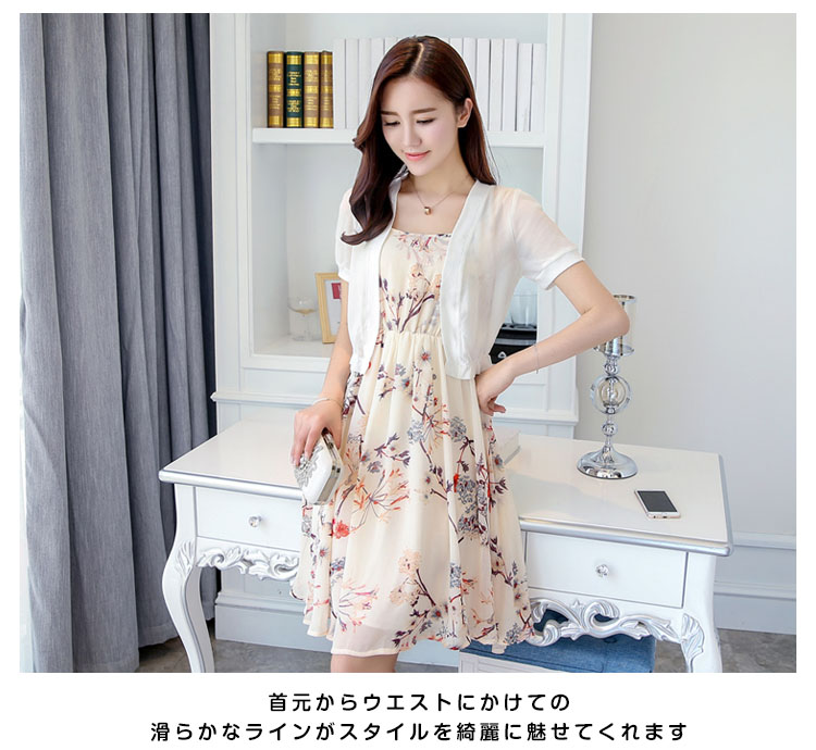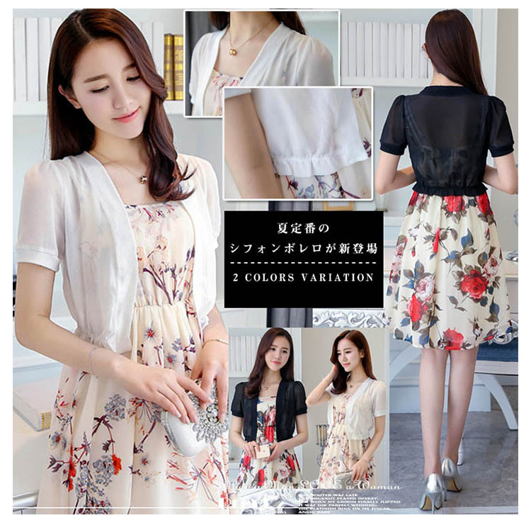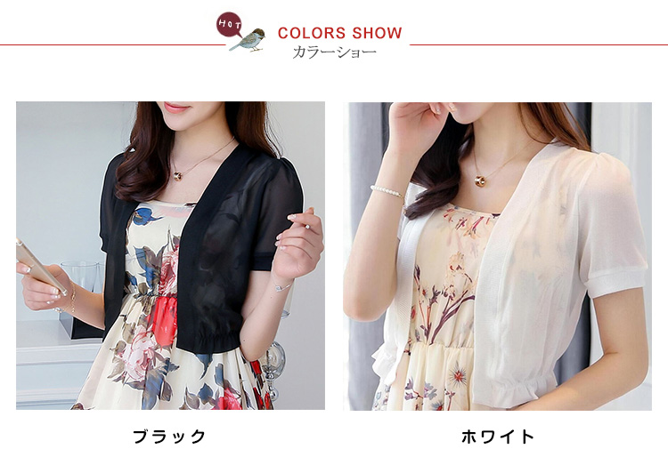 | 夏定番のシフォンボレロが新登場ふんわりとしたシフォン生地なので気になる体型をカバー首元からウエストにかけての滑らかなラインがスタイルを綺麗に魅せてくれますシンプルながら主役級の存在感を放つ一枚 | |