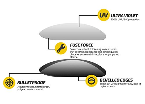 All of our lenses offer 100% UV protection, impact resistance that exceeds ANSI Z80.3 and EN 1836:2005 standards, multiple layers of the most intense and rugged hard coatings and hydrophobic coatings to keep your lenses clean and protected and, of course, a 100% money back satisfaction guarantee.