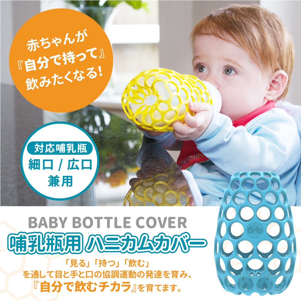 A baby bottle honeycomb cover that the baby wants to take with himself and wants to drink.