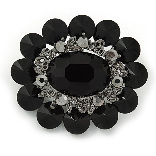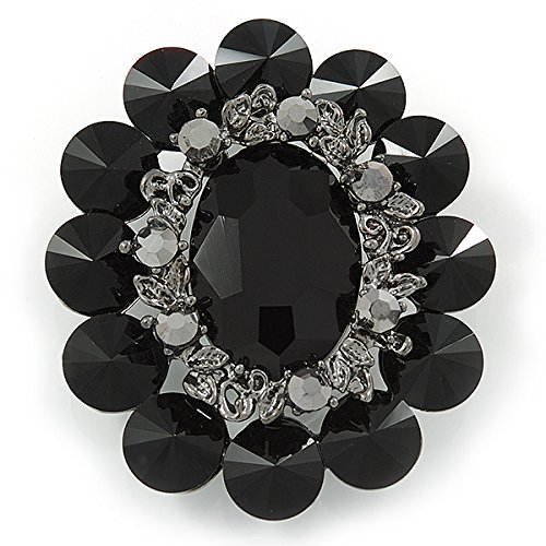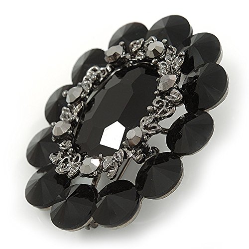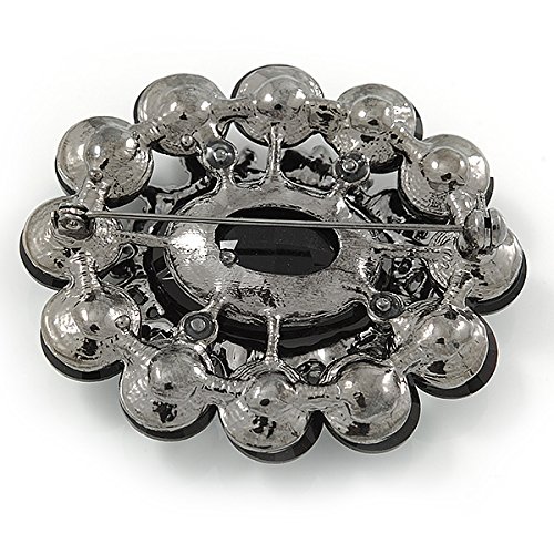 -. Title : Black Glass Stone, Crystal Oval Corsage Brooch In Gun Metal - 60mm