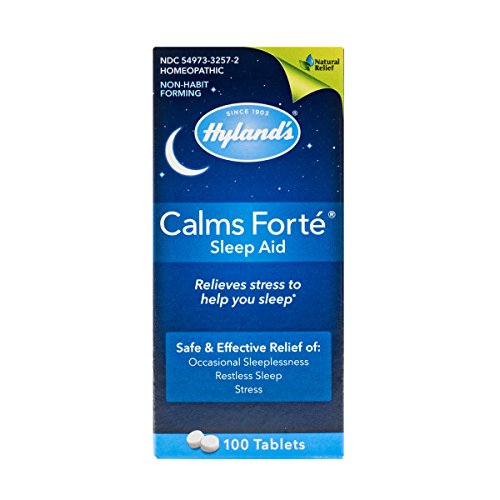 -. Binding : Health and Beauty -. Brand : Hyland's Homeopathic -. EAN : 0354973325722 -. Feature : RELIEF OF STRESS AND OCCASIONAL SLEEPLESSNESS: gentle, safe and effective Calms Forte sleep aid tablets quickly relieve symp of restless sleep and stress / NATURAL ALTERNATIVE SLEEP AID MEDICINE: Natural active ingredients includes Avena Sativa for relief of stress, nervousness; Chamomilla for relief of nervous irritability; Humulus Lupulus for relief of occasional sleeplessness; Passiflora for relief of restless sleep from exhaustion; Biochemic Phosphates to enhance cellular function. natural relief of simple nervous tension, restless sleep, stress and occasional sleeplessness / SAFETY FIRST: Calms Forte is a natural homeopathic medicine that is non-addicting and non-habit forming. No sedatives, No diphenhydramine, No artificial flavors or artificial coloring. Melatonin Free. This natural sleep aid medicine can be taken with other medications or supplements without side effects / 100 TABLETS = Up to 100 DOSES of natural stress relief sleep aid medicine / HIGHEST STANDARD OF QUALITY: all of Hyland's products follow the manufacturing and quality practices outlined in the Homeopathic Pharmacopoeia of the United States. All ingredients are tested upon receipt to ensure potency and safety -. Label : Hyland's, Inc -. Manufacturer : Hyland's, Inc -. PackageQuantity : 1 -. ProductGroup : Pantry -. ProductTypeName : HEALTH_PERSONAL_CARE -. Publisher : Hyland's, Inc -. Studio : Hyland's, Inc -. Title : Hyland's Calms Forte Sleep Aid 100 Tablets, Natural Relief of Stress, Sleep, Anxiousness, Nervousness and Irritability (Packaging May Vary) -. UPC : 354973325722