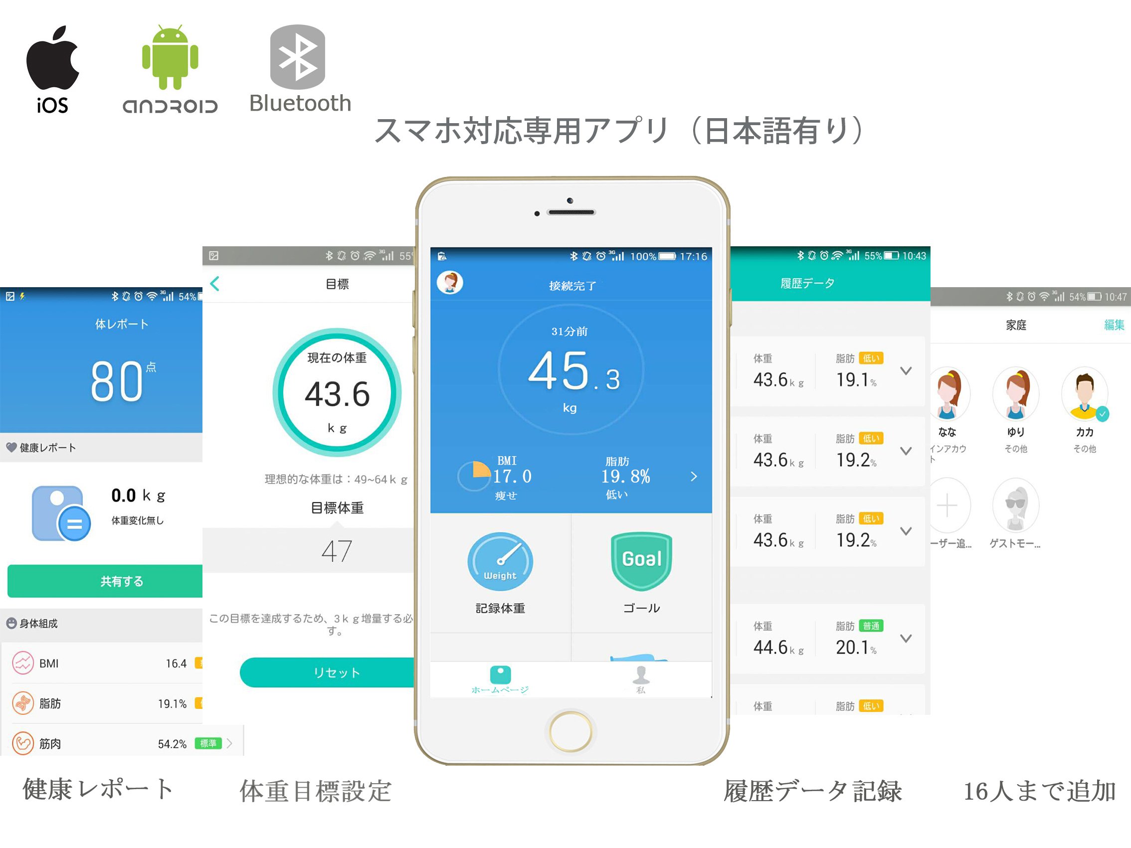 You can display changes in weight, fat, muscle, daily, weekly, and monthly changes graphically in the application, you can check the history data anytime and anywhere, and you can learn the tendency of your body's measured values to fluctuate.