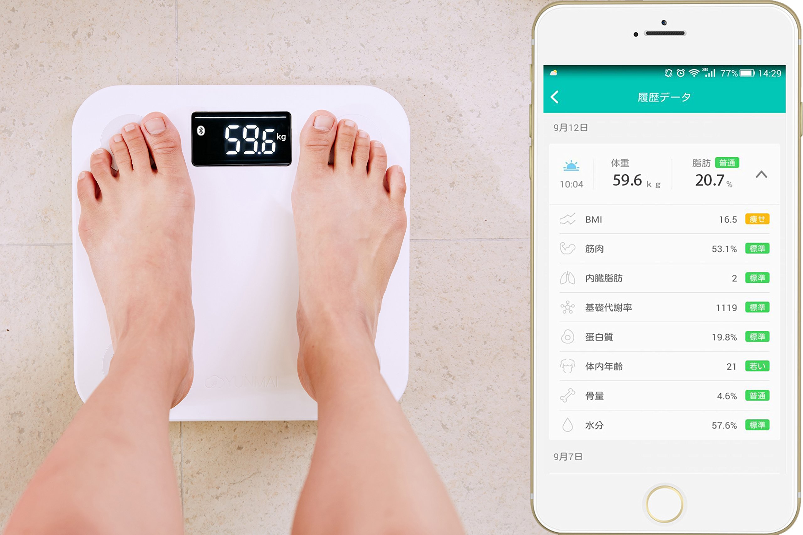 Data such as weight, body fat percentage, muscle mass, basal metabolic rate, etc. can be checked with the application.