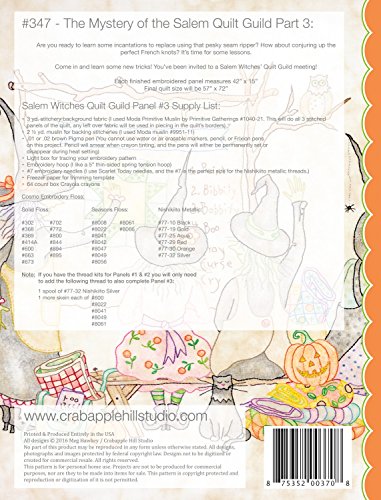 Studio : Crab-apple Hill Studio Publisher : Crab-apple Hill Studio Product Description Are you ready to learn some incantations to replace using that pesky seam ripper? How about conjuring up the perfect French knots? It's time for some lessons. Come in and learn some new tricks! You've been invited to a Salem Witches' Quilt Guild meeting! Finished panel measures 42in x 15in 0