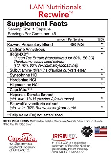 -. Binding : Health and Beauty -. Brand : i.AM NUTRITIONALS -. Feature : Contains Capsiatra - a compound naturally found in sweet peppers (may have benefits on exercise, weight management, and metabolism) / Contains IrisinXD - a patent pending blend of thermogenic phytochemicals / Creating Change Requires Action * Re:wire with Thermogenic / 45 Capsules / Total Caffeine from all sources is 200mg/serving -. Label : Iam Sports Nutritionals -. LegalDisclaimer : Keep out of reach of children. Do not use if pregnant or nursing. Consult your doctor before taking this or any dietary supplement. Discontinue use and consult your doctor immediately if any adverse reactions occur. -. Manufacturer : Iam Sports Nutritionals -. PackageQuantity : 1 -. ProductGroup : Health and Beauty -. ProductTypeName : HEALTH_PERSONAL_CARE -. Publisher : Iam Sports Nutritionals -. Size : 45 Capsules -. Studio : Iam Sports Nutritionals -. Title : i.AM Nutritionals Re:wire Thermogenic (45 Capsules)