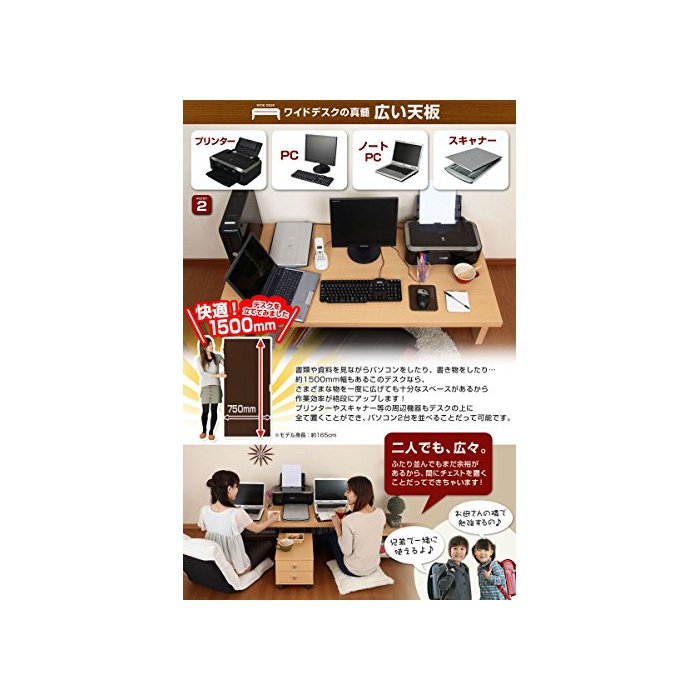 어쨌든 넓다!어쨌든 와이드!!폭은 180cm,150cm,120cm의 3타입을 준비.(길이)깊이가 무려,75cm과 통상의 데스크는 아닌 넓음을 확보했습니다.PC 데스크로서는 여유의 넓음 이고,학습 데스크로도 최적입니다.테이블로도.