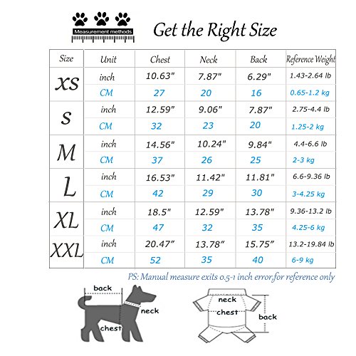 ▶Size: S,M,L,XL,XXL 【XS】 ?back length:6.29 inch(16cm) ; ? chest girth:10.62 inch(27cm) ; ?neck girth:7.87 inch(20cm), 【S】 ?back length:7.87 inch(20cm) ; ? chest girth:12.60 inch(32cm) ; ?neck girth:9.05 inch(23cm), 【M】 ?back length:9.84 inch(25cm), ?chest girth:14.56 inch(37cm),?neck girth:10.23 inch(26cm) 【L】 ?back length:11.81 inch(30cm), ?chest girth:16.53 inch(42cm),?neck girth:11.42 inch(29cm) 【XL】 ?back length:13.78 inch(35cm),?chest girth:18.50 inch(47cm),?neck girth:12.59 inch(32cm)