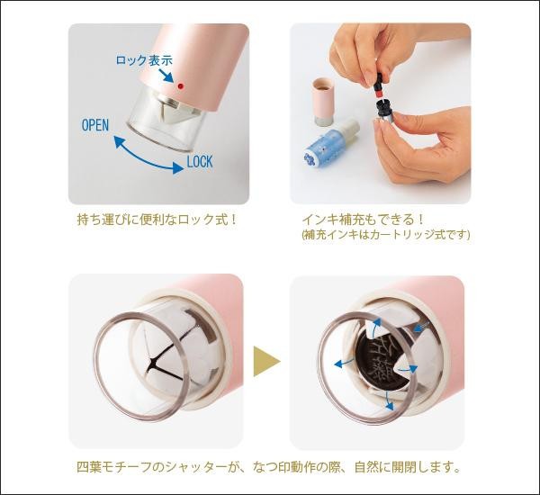 | 毎日持ち歩いても、机の上に置いてもおしゃれなスタンプ。アクリルの中に和紙をおさめた特殊加工を施しているので、柄が擦れて消える心配がありません。四葉モチーフのシャッターが、なつ印動作の際、自然に開閉します。 |