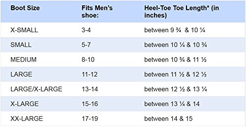 Boot size X-SMALL fits men’s shoe size 3-4: foot length measures from heel to toe between 10-1/4” and 10-3/4” Boot size SMALL fits men’s shoe size 5-7: foot length measures from heel to toe between 10-3/4” and 11-1/4” Boot size MEDIUM fits men’s shoe size 8-10: foot length measures from heel to toe between 11-1/4” and 12-1/2” Boot size LARGE fits men’s shoe size 11-12: foot length measures from heel to toe between 12-1/2” and 13-1/4” Boot size LARGE/X-LARGE fits men’s shoe size 13-14: foot length measures from heel to toe between 13-1/4” and 13-3/4” Boot size X-LARGE fits men’s shoe size 15-16: foot length measures from heel to toe between 13-3/4” and 14-1/2” Boot size XX-LARGE fits men’s shoe size 17-19: foot length measures from heel to toe between 14-1/2” and 15-1/2”