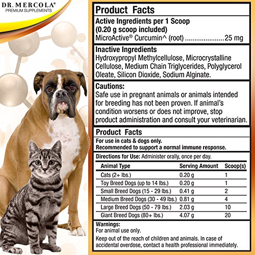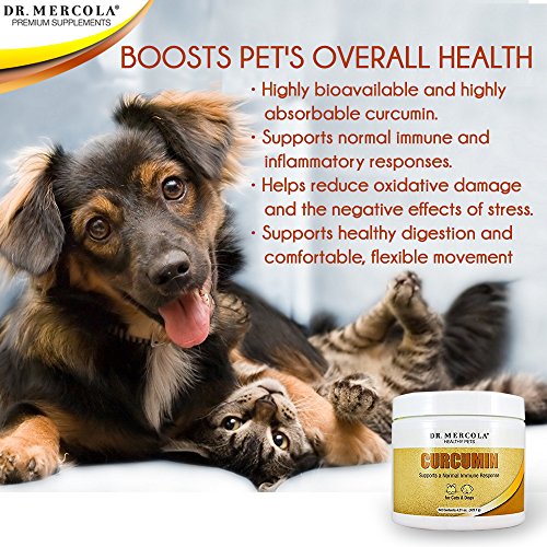 Dr Mercola Curcumin For Dogs and Cats is formulated to be a potent immune system booster and may help to combat the damage caused by free radicals. This premium choice of curcumin supplements may also help to: promote normal, healthy digestion and gut defense; aid in joint flexibility; and support a normal inflammatory response. As with all Dr Mercola pet supplements, this curcumin for pets is all natural and free from any chemical fillers, additives and excipients. Dr Mercola Curcumin For Pets enables your pet to easily access the pure health giving properties of curcumin plus the two other valuable curcuminoids found in high quality raw turmeric. So if you're looking for an effective immune system booster for cats or dogs, or you simply want to support your precious pet's overall health, look no further than Dr Mercola Curcumin For Pets.