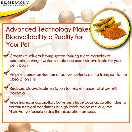 Dr Mercola Curcumin For Pets is a premium supplement formulated specifically to help support a normal immune response as well as boost your pet's overall health. Dr Mercola Curcumin For Pets is made from a high quality raw turmeric source which contains at least 95% curcuminoids. This means this supplemental curcumin for dogs and cats provides all three of the valuable curcuminoids found in turmeric. These are curcumin - the main active ingredient - as well as demethoxycurcumin and bisdemethoxycurcumin. Furthermore, this premium choice of curcumin supplements from Dr Mercola uses patented Microactive technology to ensure maximum bioavailability. One of the biggest challenges with curcumin supplements for pets and humans alike is that they tend to be unstable at intestinal pH levels and quickly eliminated from the body. The Microactive technology used in Dr Mercola Curcumin For Cats and Dogs counteracts this issue by protecting the fragile curcuminoids and providing sustained release for more efficient absorption. And most importantly, increased health benefits for your beloved pet.