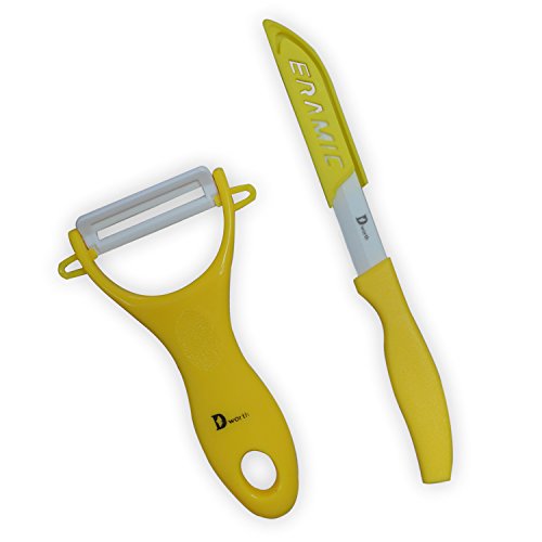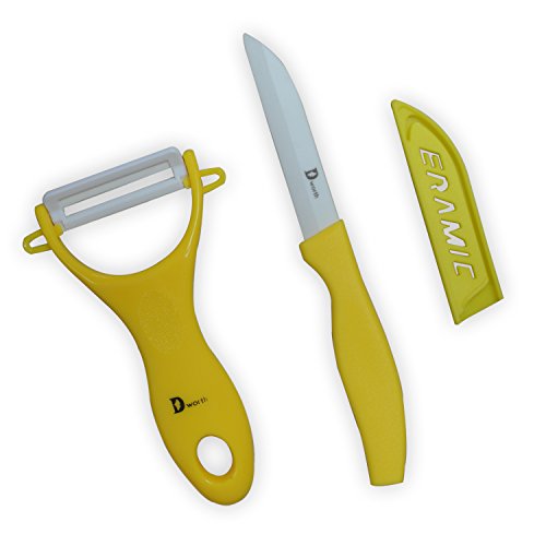 Dworth 2 Piece Multi Color Ceramic Cutlery Kitchen Knives and Peeler Knife Set (Yellow)