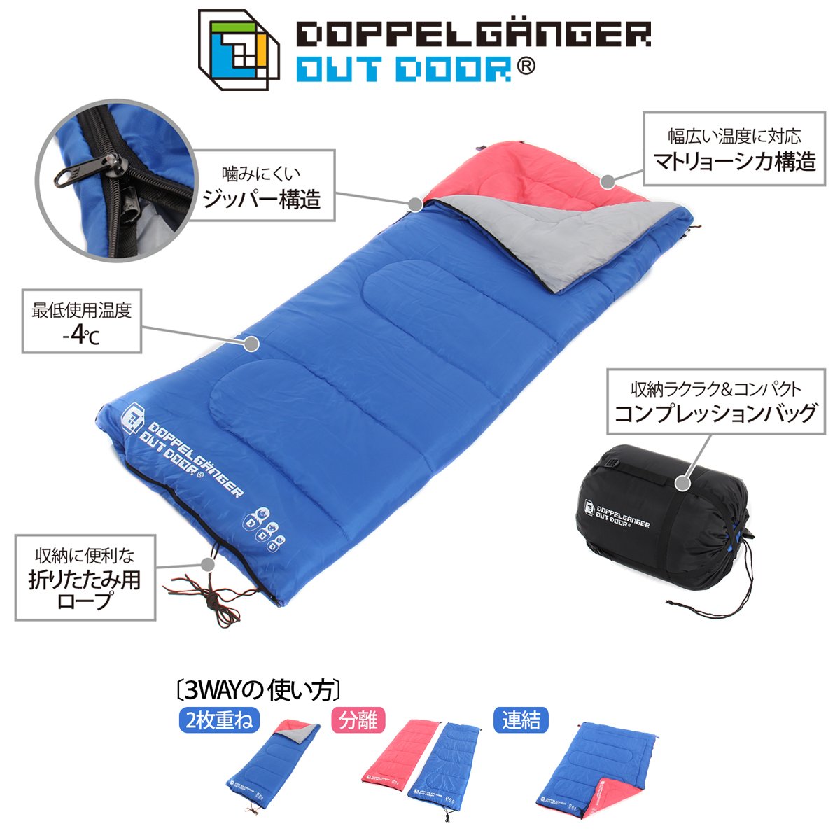 Besides using 3 WAY, storage enclosure large storage bag (compression bag), zipper structure that is hard to chew, S2-109 sleeping bag is full of easy-to-use functions even outdoor beginners.