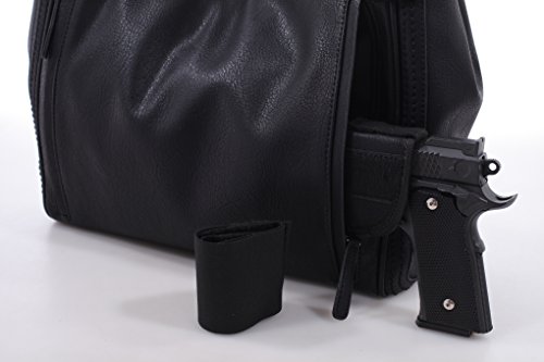 -. Feature : Dual top-carry handles with zipper closure / Interior zipper pocket and open cell phone pockets / Separate concealed compartment with right or left openings / Removable holster included / Dimensions: 14in x 5.5in x 12in