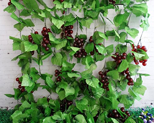 Meiliy 8 Ft Artificial Greenery Chain Grape Ivy Leaves + Artificial Grapes Vine Foliage Simulation Flowers Plants For Home Room Garden Wedding Garland Outside Decoration,Pack of 5This is a artificial Grape Vine, which is constructed of plastic and fabric material. Unlike ths real plants, this Grape Vine will never die off, so that it can be a nice decoration for a long time. Hanging this Artificial Grape Vine, it will be a beautiful decoration for your room or office.