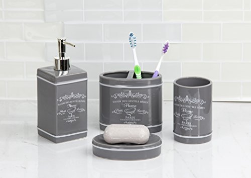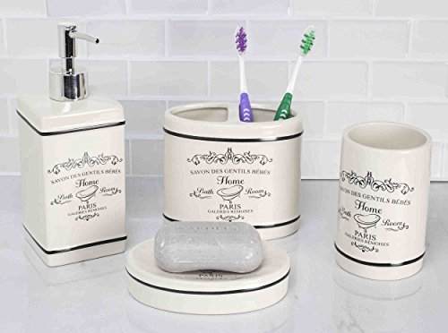 -. Brand : Home Basics -. Feature : 4 Piece Bathroom Set includes 1 tumbler; 1 soap dish; 1 liquid soap dispenser; 1 toothbrush holder / Made of ceramic / Great gift choice for any occasion / Functional and stylish accent decor for any bathroom. / Wipe clean -. Label : Home Basics -. Manufacturer : Home Basics -. PackageQuantity : 1 -. ProductGroup : Home -. ProductTypeName : HOME_BED_AND_BATH -. Publisher : Home Basics -. Studio : Home Basics -. Title : Paris Collection 4 Piece Bathroom Accessory Set