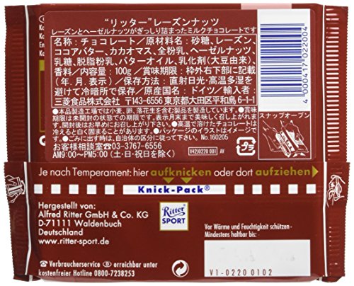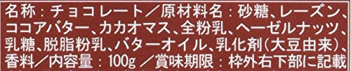 原材料:砂糖、レーズン、ココアバター、カカオマス、全粉乳、ヘーゼルナッツ、乳糖、脱脂粉乳、バターオイル、乳化剤(大豆由来)、香料